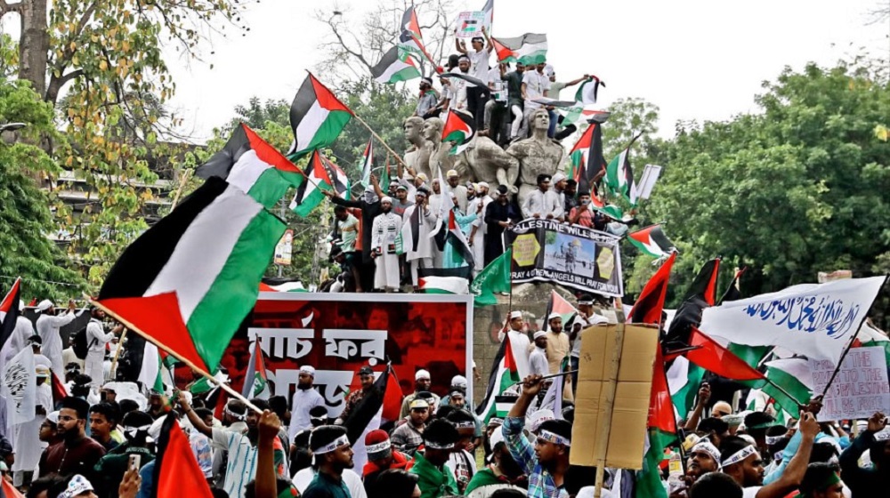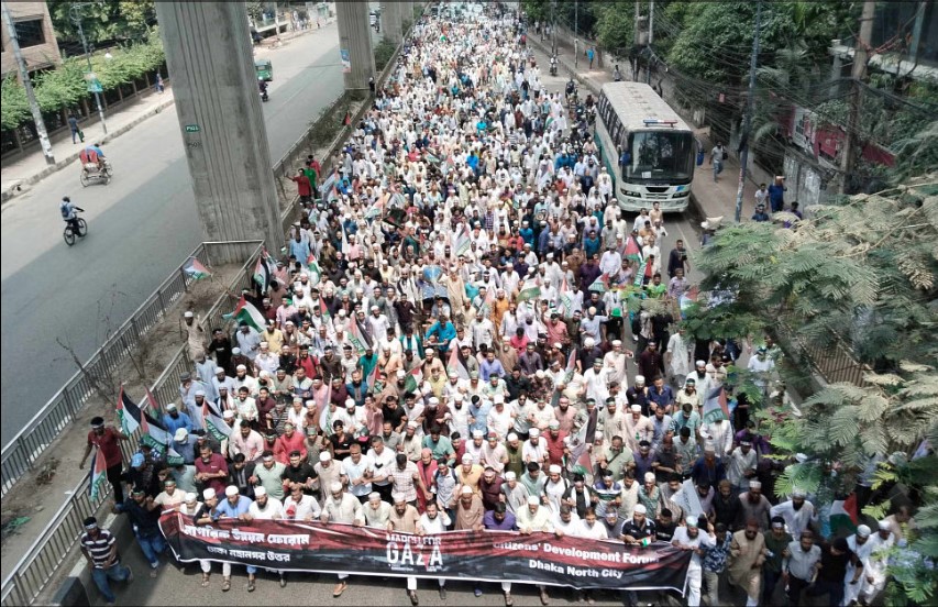 ইসরায়েলি আগ্রাসনের বিরুদ্ধে ‘প্যালেস্টাইন সলিডারিটি মুভমেন্ট বাংলাদেশ’-এর আয়োজিত ‘মার্চ ফর গাজা’ কর্মসূচিকে ঘিরে ঢাকার ঐতিহাসিক সোহরাওয়ার্দী উদ্যান রূপ নিয়েছে মানুষের সমুদ্রে।