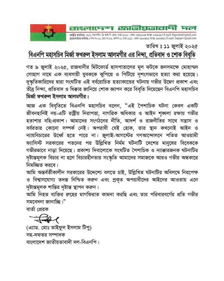 মির্জা ফখরুল বলেন, জুলাই-আগস্টের গণআন্দোলনে পতিত আওয়ামী ফ্যাসিস্ট সরকারের পতনের পর উল্লিখিত নির্মম ঘটনাটি দেশের মানুষের বিবেককে গভীরভাবে নাড়া দিয়েছে। প্রকাশ্য দিবালোকে সংঘটিত পৈশাচিক ও ন্যাক্কারজনক ঘটনাটির দৃষ্টান্তমূলক বিচার না হলে বিচারহীনতার সংস্কৃতি আমাদের সমাজকে আরও গভীর অন্ধকারে নিমজ্জিত করবে।
