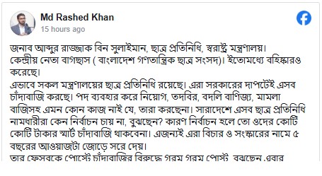 রাশেদ খান লেখেন, “এভাবে সব মন্ত্রণালয়ের ছাত্র প্রতিনিধি রয়েছে। এরা সরকারের দাপটেই এসব চাঁদাবাজি করছে। পদ ব্যবহার করে নিয়োগ, তদবির, বদলি বাণিজ্য, মামলাবাজিসহ এমন কোনো কাজ নাই যে, তারা করছে না।”