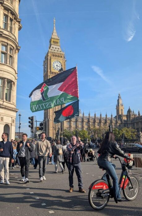 নূরুদ্দিন আহমেদ, লন্ডনভিত্তিক সংগঠন বেঙ্গলিজ ফর প্যালেস্টাইন (BfP)-এর প্রতিনিধি, বলেন, “এই সংগ্রাম ন্যায়বিচার ও প্যালেস্টাইনের জনগণের অধিকার অর্জনের সংগ্রাম। আমাদের কেউই মুক্ত নই, যতক্ষণ না প্যালেস্টাইনের জনগণ মুক্ত হয়েছেন ।” তার সহকর্মী রাজনউদ্দিন জালাল যোগ করেন, “এই কারণেই আমরা আবারও, শত-সহস্র মানুষ নিয়ে, লন্ডনে মিছিল করছি।”