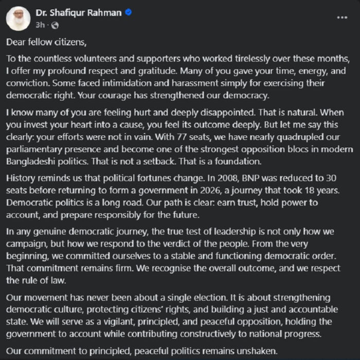 শফিকুর রহমান আরও লিখেন, যেকোনো প্রকৃত গণতান্ত্রিক অভিযাত্রায় নেতৃত্বের আসল পরীক্ষা শুধু নির্বাচনী প্রচারণায় নয়, বরং জনগণের রায়কে কীভাবে গ্রহণ করি তার ওপর নির্ভর করে। শুরু থেকেই আমরা একটি স্থিতিশীল ও কার্যকর গণতান্ত্রিক ব্যবস্থার প্রতি প্রতিশ্রুতিবদ্ধ ছিলাম, সেই প্রতিশ্রুতিতে এখনো অটল। আমরা সামগ্রিক ফলাফলকে স্বীকৃতি দিচ্ছি এবং আইনের শাসনের প্রতি শ্রদ্ধা জানাচ্ছি।