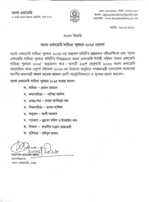 বিজ্ঞপ্তিতে বলা হয়, “বাংলা একাডেমি সাহিত্য পুরস্কার ২০২৫-এর ‘প্রস্তাবক কমিটি’র প্রস্তাবনার পরিপ্রেক্ষিতে এবং ‘বাংলা একাডেমি সাহিত্য পুরস্কার কমিটি’র সিদ্ধান্তক্রমে বাংলা একাডেমি নির্বাহী পরিষদ ‘বাংলা একাডেমি সাহিত্য পুরস্কার ২০২৫’ অনুমোদন করে।”