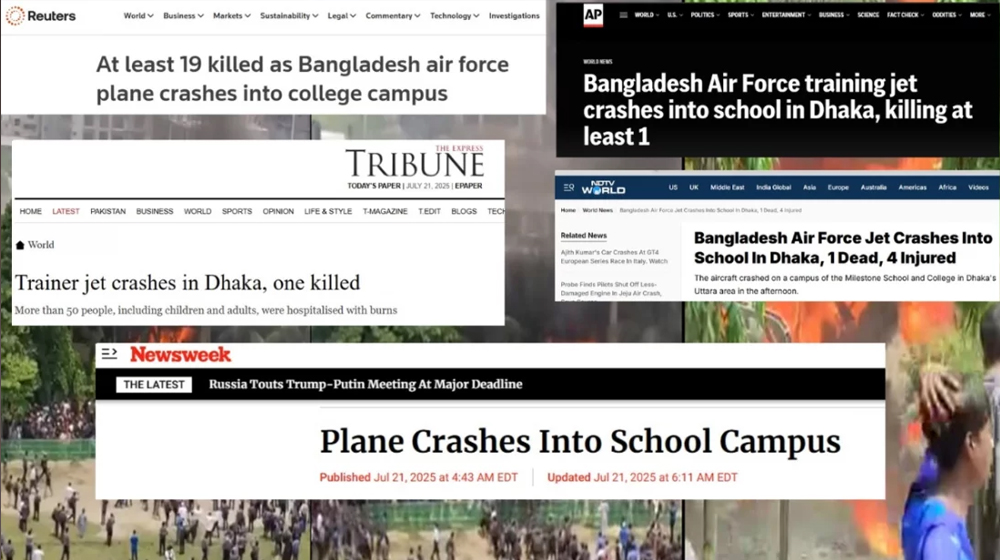 রাজধানীর উত্তরায় বাংলাদেশ বিমানবাহিনীর একটি প্রশিক্ষণ বিমান মাইলস্টোন স্কুল অ্যান্ড কলেজের একটি ভবনে বিধ্বস্ত হওয়ার ঘটনা আন্তর্জাতিক গণমাধ্যমেও ব্যাপকভাবে প্রচারিত বিস্তারিত...
